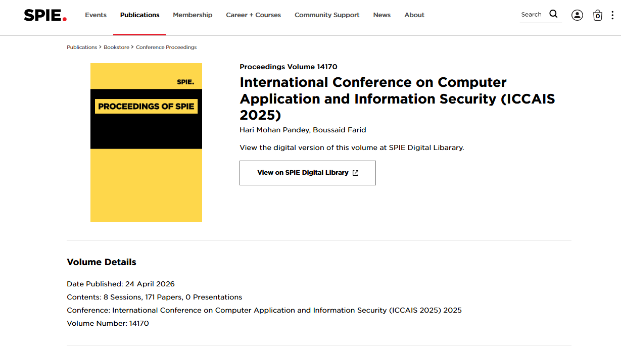 All accepted papers by ICCAIS 2025 have been published by Society of Photo-Optical Instrumentation Engineers (SPIE) (Print ISSN: 0277-786X, Online ISSN: 1996-756X) and indexed in EI Compendex successfully!